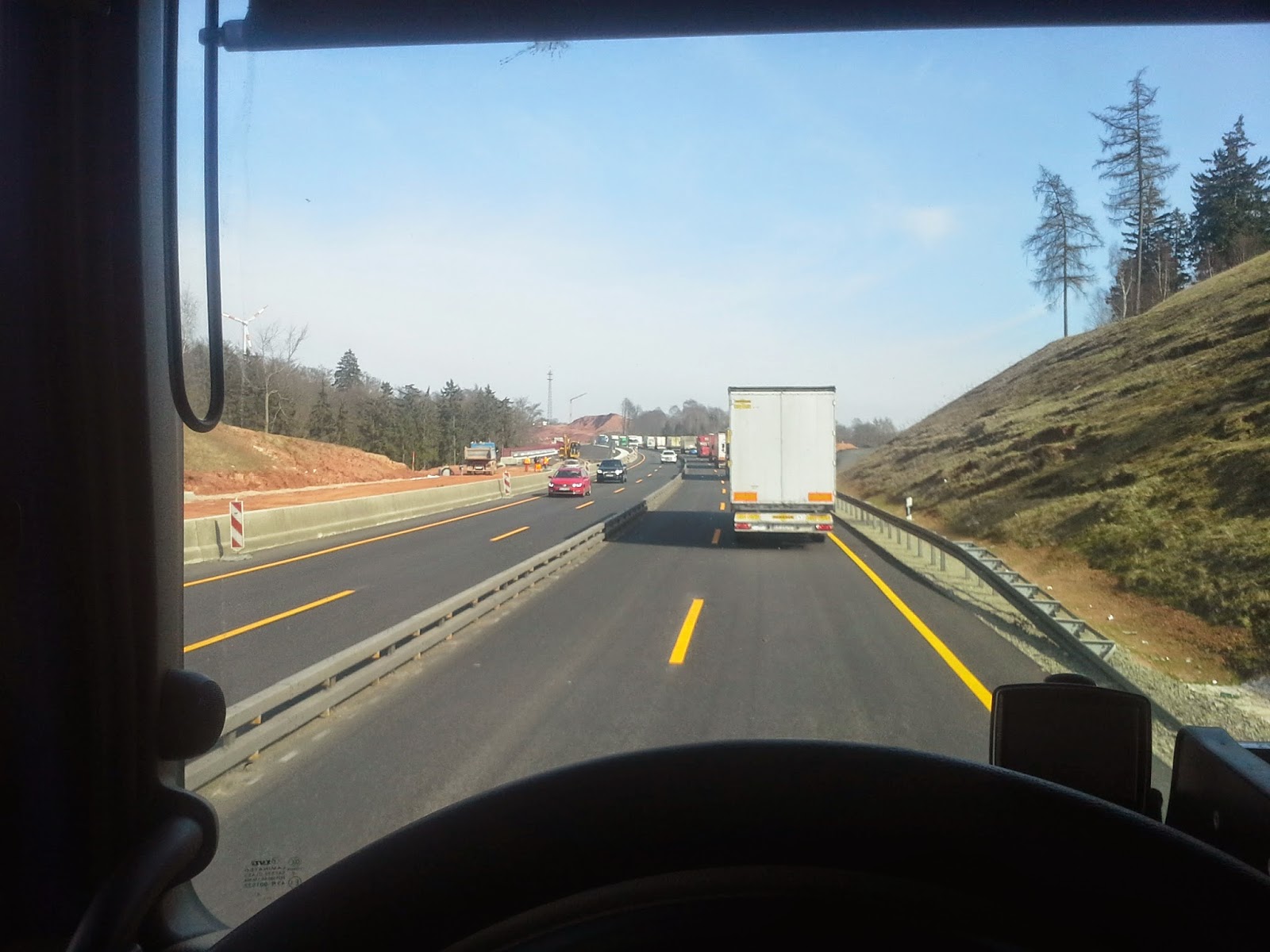 Vyjíždím za tmy a na východ, čili mě čeká krásný východ slunce. To je ta chvíle, kdy mě sere, že fotím obyčejným mobilem a nemám třeba zrcadlovku. Čili přibližně 120 fotek během hodiny, použitelných je asi 10. Ale podívaná pěkná, o tom žádná. Za 4h přilítnu před Prahu na OMV. Jelikož je už 9h, tak sem si naivně myslel, že vpohodě zaparkuju. Omyl, parkuju na výjezdu z dálnice a to ještě tak blbě, že sem si o obrubník seškrábl nápis na pravém předním kole. Po hodinové pauze pokračuju. Moc to nejde, za 2km stojím v koloně. Při čekání z předemnou stojícího kamionu vylézá řidič a šněruje na konec návěsu. Zohne se k zadní lampě, čtyři dobře mířené údery do světla a levý blinkr opět bliká. Podíval se na mě, oba jsme se usmáli a šněroval to zpátky. Kilometrový úsek projíždím v rekordním čase, bez pár minut rovné dvě hodiny. Autopřepravník nedobrzdíl před kolonou, tak natlačil před sebou stojící dodávku pod menší kamion. Prý jen lehké zranění. Další cesta už klidná. Ve Chvojenci se míjím se svým bývalým Dafem a ve Vysokém Mýtě s dalším kamarádem z Truck fóra zrovna ve chvíli, kdy se vyhýbám kanálům v silnici, takže si ho hned nevšímám. Teda do té doby, kdy mi mohutně zatroubil asi metr a půl od kabiny, to sem potom okamžitě věděl, která bije. U Svitav na mě mává někdo z protijedoucího kamionu, avšak nikdo zatím známý. 15 minut pauza v Moravské na nákup a 30 minut pauza na Studené Loučce. Dávám na FB výzvu na toho, kdo na mě před chvílí mával a za 5 minut už je jasno, příště si na tebe, Luky, dám pozor :) ... Když po pauze vyjíždím, volám kamarádovi a náááhodou zjišťuju, že je 10km předemnou. Zastavíme na pumpě a chvíli vykládáme. Mezitím se vedle mě postavila celní správa a měli tam nějakou polskou cisternu. Když cisterna odjela, tak policisté koukali na můj zakrytý náklad a značně poškozenou plachtu, které dal větr co proto. Já raději zamkl kabinu a vzdálil se od vozu. Šašci na to koukají dalších 15 minut. Nedá se jinak, skáču za volant, rychle foukám vzduchu a s kamošem bleskově mizíme z parkoviště. Při výjezdu si v zrcátku všímáme, že naopak na pumpu sjíždí další kamarád, tak zase zastavujem na dalším parkovišti, na pár slov a také fotek. Za 5 minut vedle nás zastavuje opět ona celní správa, tentokrát mají nějaký osobák. My se opět tváříme nenápadně. Když policisté odjíždějí, koukají na nás, kroutí hlavou a usmívají se. Hehe, ještě, že se jen smějí a nechtějí s náma mluvit. Pokračujem, jeden kamarád na Brno, druhý kamarád na Ostravu a já tak nějak mezi na Přerov. Za Přerovem počítám dobu jízdy a hrabu v paměti, kdeže se dá během hodiny zaparkovat. Vítězí hned první parkoviště, u motorestu v Břestu. Na vjezdu míjím značku „zákaz stání pro kamiony v době 22-06h“. No prima, takže s trochou smůli to bude placené parkoviště, když mě tu do rána vyberou pomahači. Postavím to vedle dalších dvou kamionů a mizím do motorestu. Po hodině sem zpět, žádný lístek za stěračem, tak nastavím budík na mobilu, připojím jej na nabíječku a jdu spát.